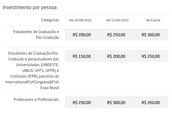 | Categorias | Até 20/08/2019 | Até 15/09/2019 | No Evento | |||